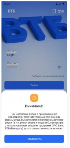При успешной авторизации в приложении появляется диалоговое окно с предупреждением о рисках при использовании внешних программ (рис. 2), кнопка «Продолжить» ведет на страницу создания код-пароля (рис. 3).