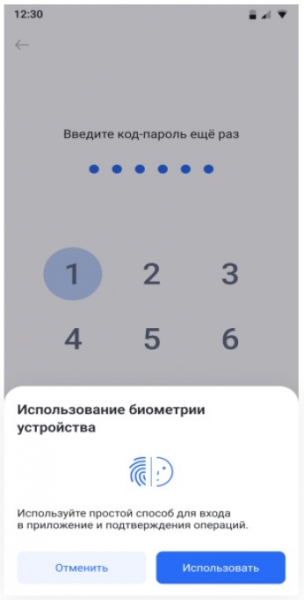 После создания код-пароля, диалоговое окно предложит использовать биометрические данные (отпечаток пальца/сканер лица) для входа в приложение (рис. 4). Вам доступно изменение настроек входа по биометрическим данным в разделе «Мой ВТБ» – «Настройки» – «Безопасность» – «Использование биометрии» авторизованной зоны системы ДБО.