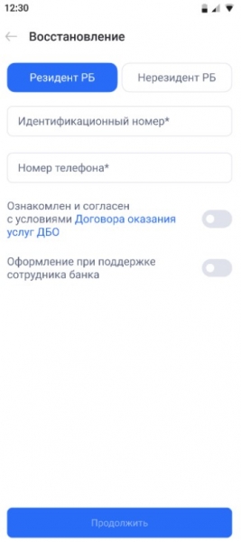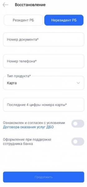 На странице «Восстановление» Вам необходимо выбрать резиденство: резидент/нерезидент РБ.